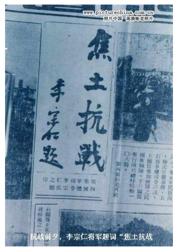 1937年7月7日,全面抗战爆发。短短两个月中,李宗仁在广西动员了近二十万部队先后开赴抗日前线。9月,国民政府任命李宗仁为第五战区司令长官。李宗仁临危受命,坐镇徐州,指挥著名的徐州会战。会战中,李宗仁指挥有方,体恤部属,我三军将士以落后之装备,众志成城,歼敌一万余人,取得轰动中外的台儿庄大捷,李宗仁成为人们心目中的抗日英雄。